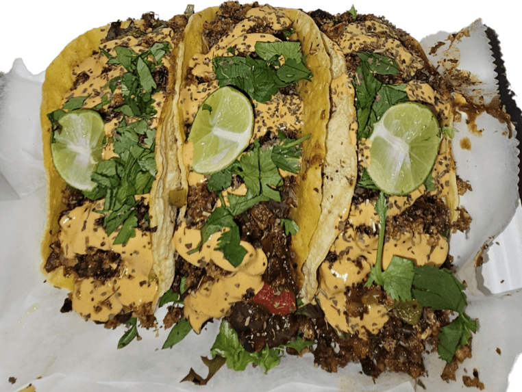 Grilled Oyster Mushrooms or Walnut Meat Grilled in Adobo & Sofrito, Bell Peppers, Red Onions, & NO HEAT JALAPENOS Grilled in Sazon, topped with Keylime Queso!!! comes with 3 tacos.