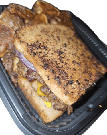 Walnut Meat Patty, No Chill Chili, Red Onions, & Mustard made on Garlic Bread.