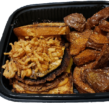Two Walnut Meat Patties, Vegan Bacon, Sweet Pickles, a slice of melted Vegan Cheddar, Red Onions, Ketchup & Mustard on a toasted Bun (comes with side)
